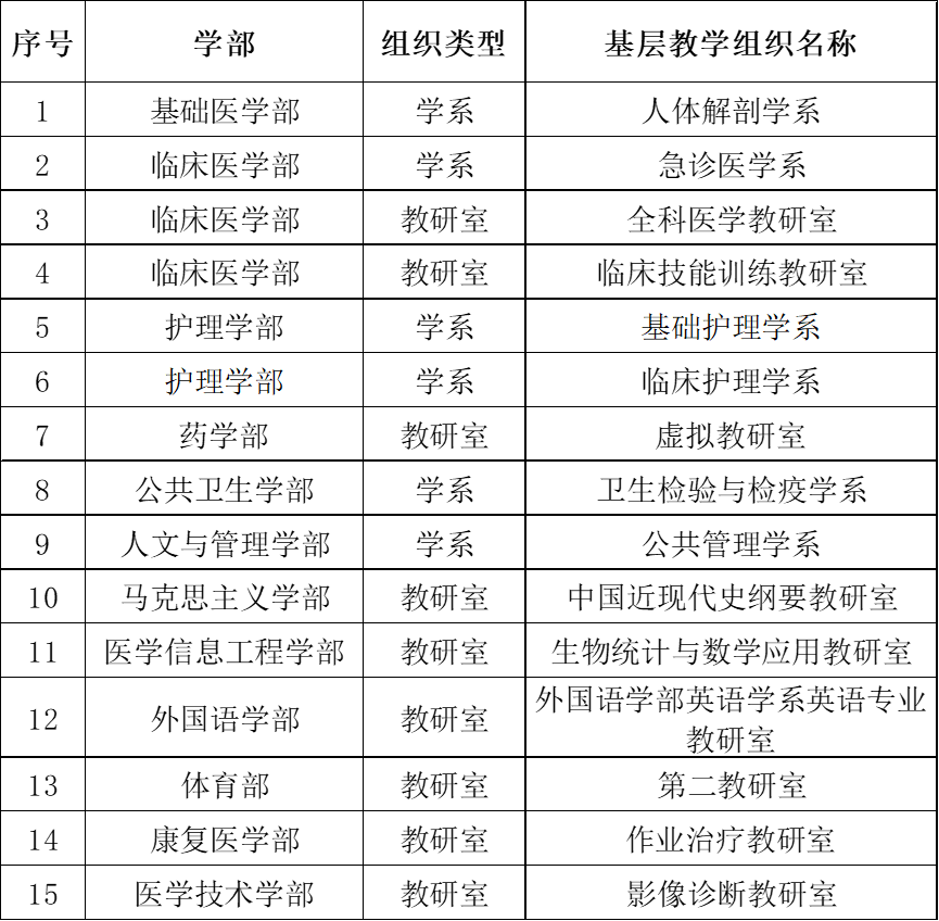 根据《南京医科大学康达学院加强基层教学组织建设实施办法》和《关于开展南京医科大学康达学院基层教学组织2024-2025学年考核工作的通知》等文件精神,经学部推荐、教务处审核、考核小组评审,最终评选出南京医科大学康达学院2024—2025学年优秀基层教学组织15个,优秀基层教学组织负责人15人,现将具体评优结果公示如下:
